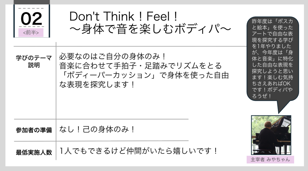学びの日。研修日の時間で半日おかれている。子どもたちのカリキュラムでいえば、マイプロジェクトのような時間。有志のスタッフが場を開く。例えば、今年度は「Don’t Think! Feel!〜身体で音を楽しむボディパ〜」のように日々の実践から遠いものもあれば、「探究スキルと情報活用のための手引きづくり」のように日々の実践に直結するようなものもある。ひらかれた場を一人ひとりのスタッフが自分の興味・関心に基づいて選んで、学びを深めていく。これはとっても大切な時間。