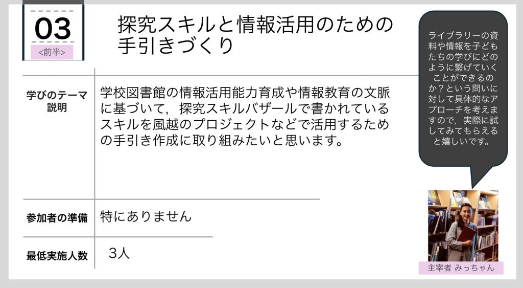 9月頃、ふぅが「今まで大切にしてきた幼稚園と小学校1・2年生の接続についてアウトプットしたい!」と言うので、9/10(水)のスイゴゴはマルシェ(お題を持ち込み形式)というかたちにした。ありがたいことに4つもお題が集まったので、次のような構成にした。