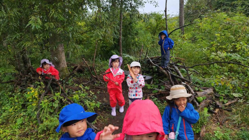 チハヤに「ぶたとおおかみのやつやろ〜」と声をかけられた。以前から年少さんがぶた、ぴょん(阿部)やスタッフがおおかみ役で追いかけっこをしていた。からまつ林を逃げ回ったり、草むらに隠れたりしているうちに年少さんが集まってくる。