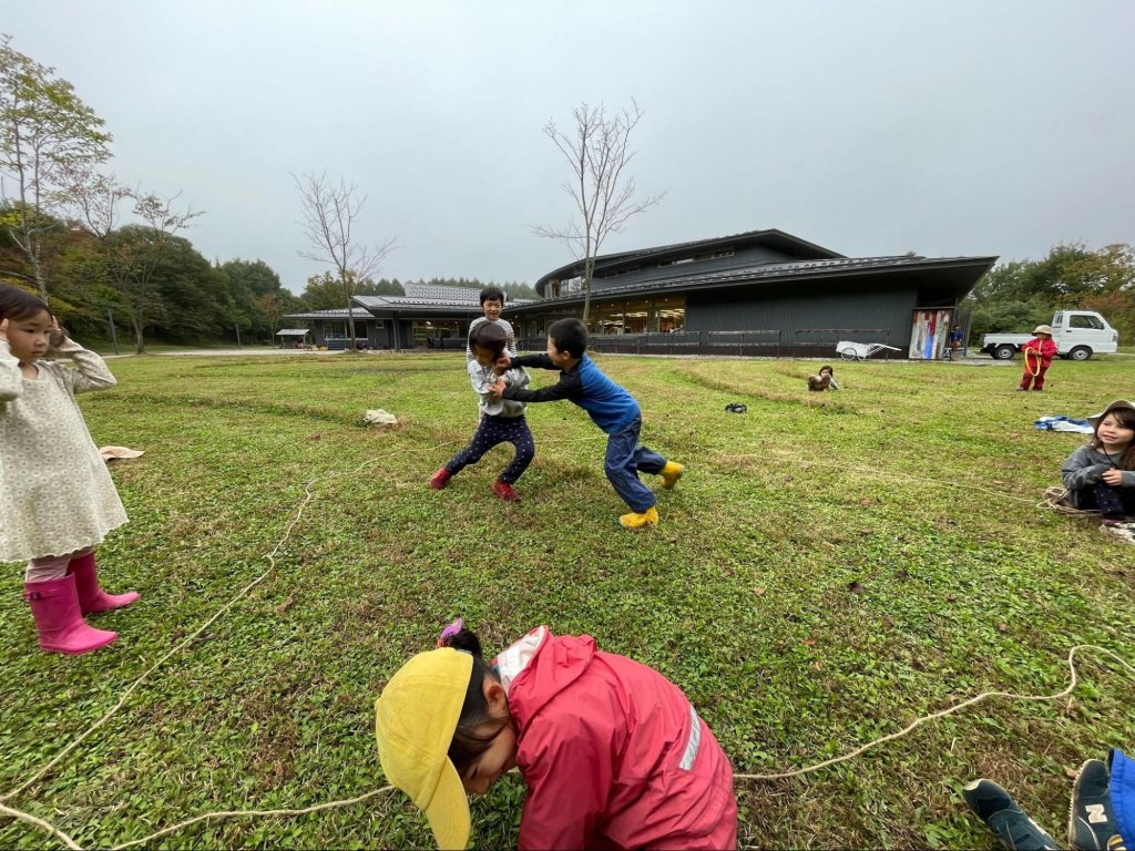 ずっと見ていた年少のハルチカとユウゴは、年長がそこを去ってからロープが片付いた芝生で2人相撲を始めた。やっと俺達の番がきた!と思ったのかもしれない。