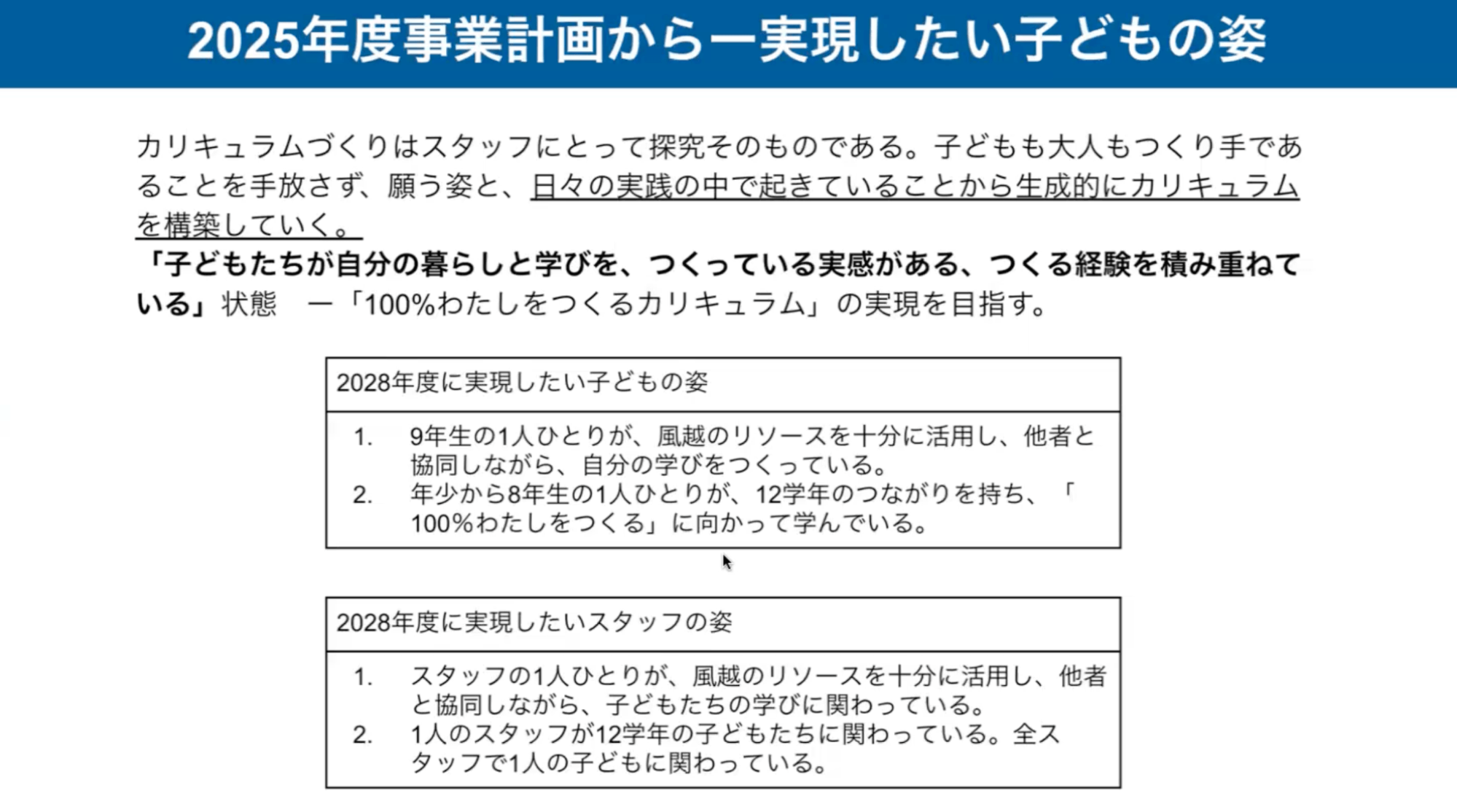 事業計画を改めて見ていたら、「実現したい子どもの姿」という言葉があって、これは幼稚園だけでなく義務教育学校でも共通して掲げていて、そこには「100パーセントわたしをつくるカリキュラムの実現を目指す」とあります。つまり、子どもたちが“自分の暮らしと学びをつくっている実感”を持ち、その経験を積み重ねていくこと。それを幼児期から中学校卒業まで、12年間ずっと続けていくイメージなんです。