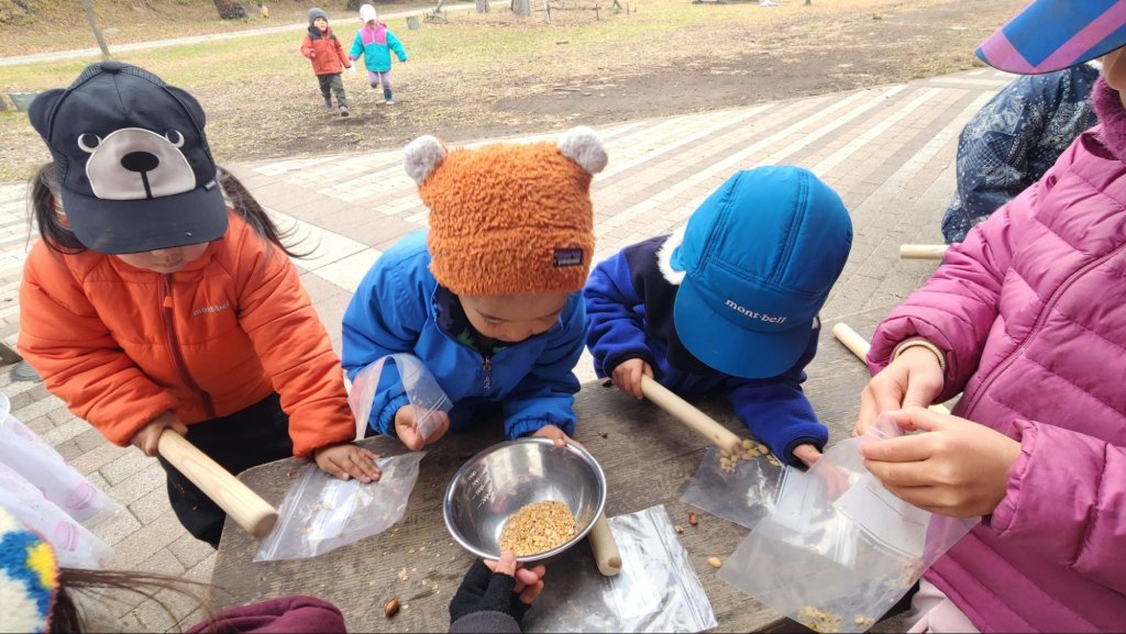 ある日、遠くに散歩に行った帰り道にどんぐりの硬い殻を剥きながら「どんぐりジャム作りたいんだよね〜」と言う声があがる。森の動物たちはこのどんぐりや松ぼっくりを美味しく頂いている。私たちも食べてみたいという提案からどんぐりジャムを作ってみた。(どんぐりペーストみたいな感じ。味はご想像にお任せ。)
