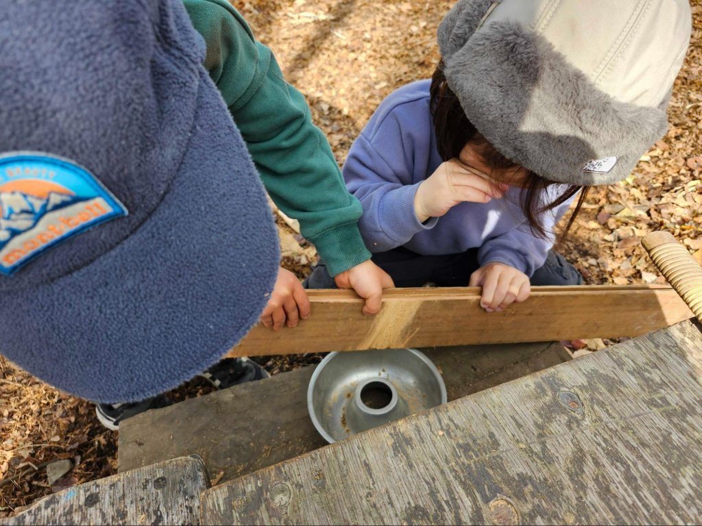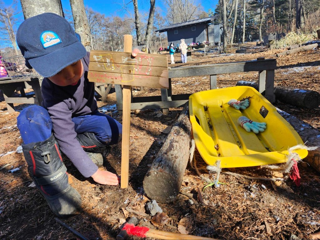 森の中、子どもたちにとって『木』は様々な意味を持ち合わせている。「どんぐりのおかあさ〜ん」と仰ぎ見る木もあれば、朽ちた木を割いてごっこ遊びのご飯にしたり、洞にどんぐりを届けてリスの家を想像したりする。枝は道に迷ったときの『棒の神様』になったり、泥筆になったり、顔を描くと赤ちゃんにもなる。加工された板は一本橋の道になったり、楽器になったり…。子どもたちの手の中で、そのものの意味が広がっていく。