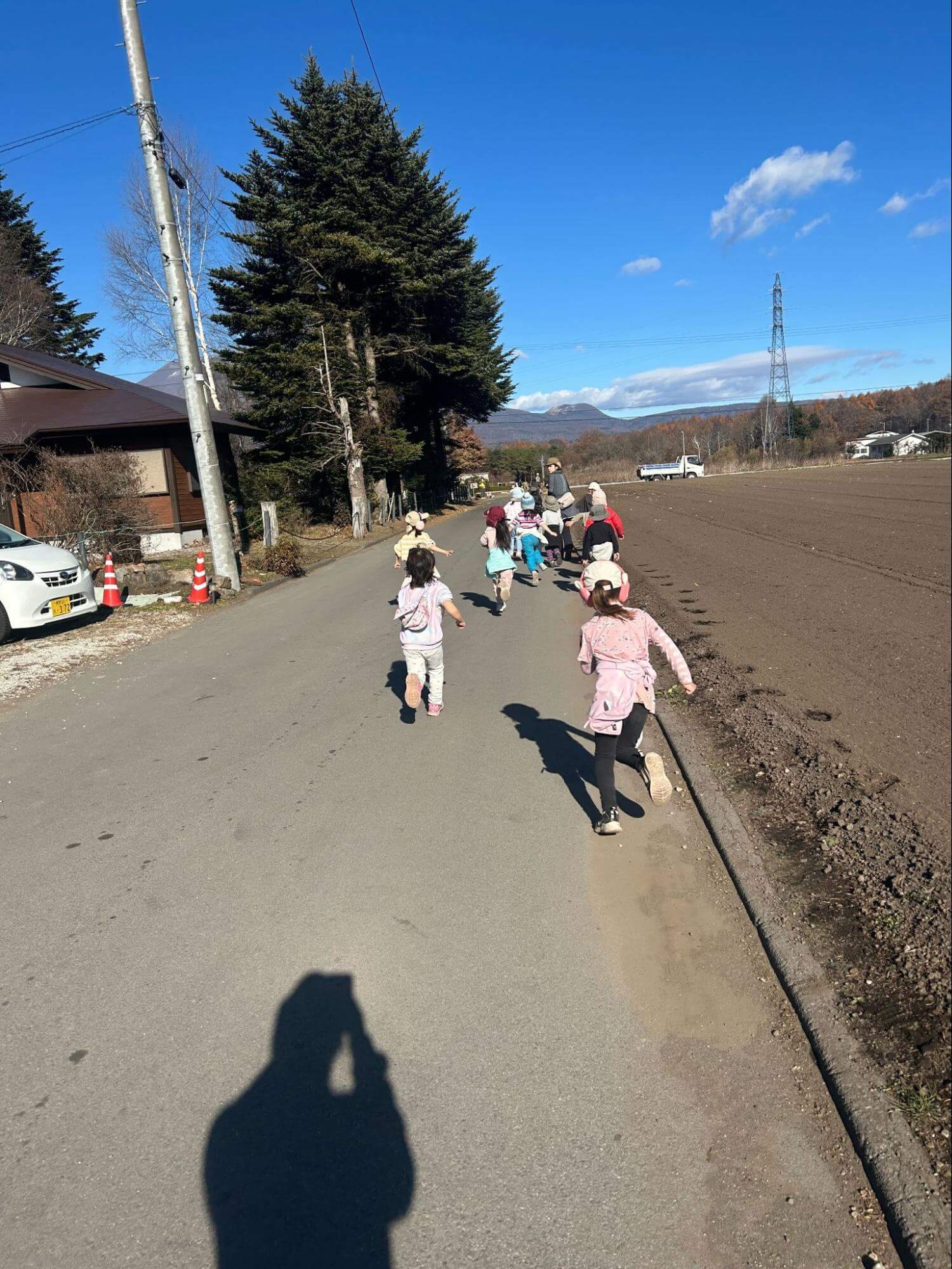 年長チームの中には、走ることが得意な子もいれば、苦手な子ももちろんいる。どんな反応が返ってくるかな…と私もドキドキしていると、ハルキ「俺もやりたいと思ってた!」という声から続々と「遠足やりたい!」の声。みんなで「やってみよう!」という流れになった。すると、アンナが「練習したいな〜」とつぶやく。その声で、お兄さんお姉さんたちが練習しているコース(森の中にもピンクのリボンが目印としてぶらさがっている)で早速みんなで練習してみることになった。