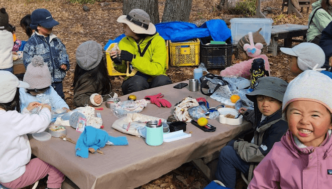 森の木々が赤や黄色に染まり,秋も深まってきた頃。散歩に出掛けるたびにどんぐりや松ぼっくりを拾ってお土産いっぱいで帰ってくる年少の人たち。