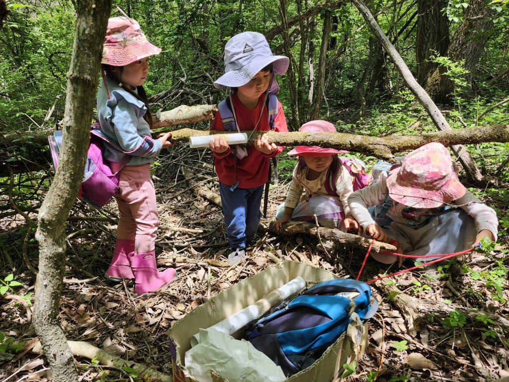 偶然に起こることがたっぷりの探検で、スタッフが通る道を決めていたら、倒木は通らなかっただろうし、子どもたちが(棒で)神様に決めてもらって行こうと決めて進んでいるからこそ、自分たちで乗り越えていく、楽しい時間にしようみたいな雰囲気が生まれたんだろうなと思っています。