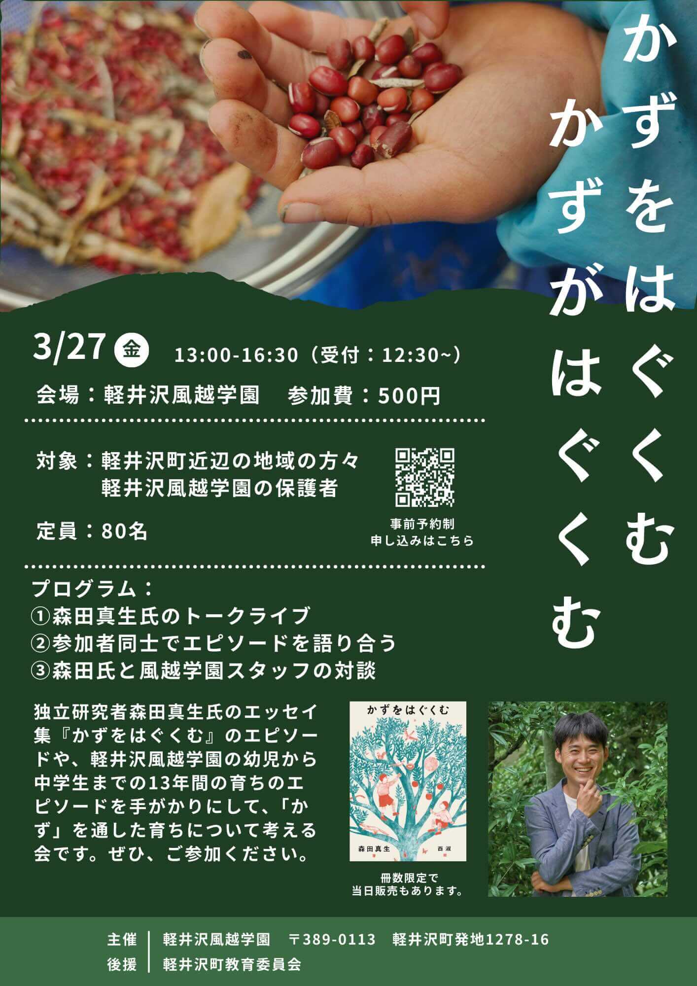「かず」についての12年の学びについて考え合うことはめったにない機会で風越学園ならではだなと思います。この学びをぜひ多くの方たちと分かち合えたらと思いました。そこで、著者の森田さんをお招きして、幼児期から始まる「かず」との出会いから、「かず」を育むこと、「かず」が育んてくれることについて、おしゃべりが出来たらと企画しました。近隣の方もお誘いしたいと思っていますので、ぜひ、お誘い合わせのうえ、ご参加いただけたらと思います。短い時間ですが、「かず」の魅力をみなさんで分かち合いましょう。